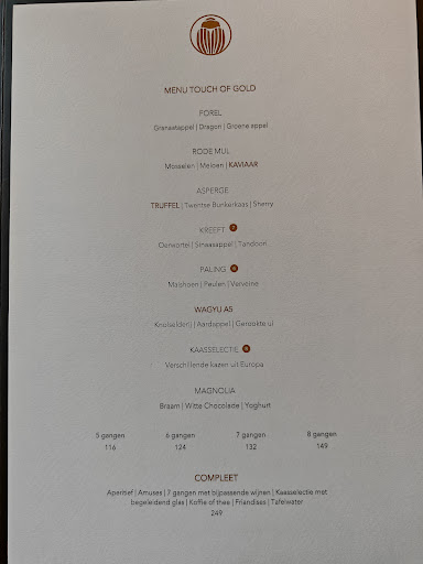Na dat wij onze plaatsen hadden ingenomen kregen wij de verschillende kaarten van Joann te zien. Voorheen had Joann een vast menu, op moment van schrijven is dit concept aangepast, wat ik zelf een zeer positieve verandering vind. Voor de "vaste" gast is "Menu Joann" een begrip, echter heeft Joann op dit moment ook het "menu touch of gold", eigenlijk is dit het zelfde menu alleen met de volgende verschillen. Bij Menu Joann krjig je bij de rode Mul een ingrediënt Vadouvan, bij touch of gold is dit Kaviaar. Bij de Asperge krijg je bij Menu Joann aardbei, bij Menu touch of Gold is dit truffel. Tevens krijg je in plaats van Rogvleugel & Kalfswang een zeer mooi stukje Wagyu A5 bij het menu Touch of Gold. Prijs verschil in het bovenstaande geval, 7 Gangen Menu Joann is 99€, 7 gangen Menu Touch of Gold is 132€, is het het geld waard om Menu Touch of Gold te nemen? Wij vinden het van wel, zeker de moeite waard! Onderstaand de redenen voor ons om in de toekomst wederom weer voor dit menu te kiezen.