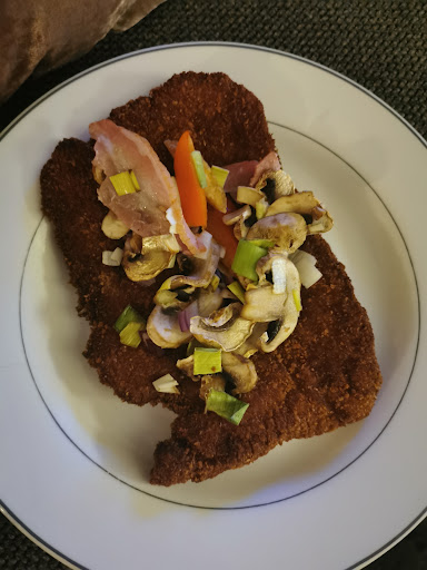 De schnitzel was te hard gebakken (frituur?), de topping had champignons met spek moeten zijn (zie foto) en de patat was veel te lang gebakken. Het was naar mijn mening de 17,50 per gerecht niet waard helaas. Daar verwacht ik wel een lekkere gebakken schnitzel voor van de slager met verse champignons en lekkere spekjes als topping.