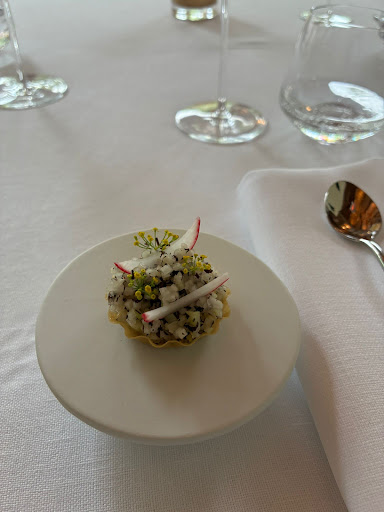 Eenmaal binnen verraste het interieur met zijn lichte kleuren en subtiele historische accenten. De attente sommelier overtuigde met zijn gedegen kennis, en begeleidde ons op een aangename, kundige manier. Dit met respect voor budget, zonder opdringerig te zijn. Zijn keuze van wijnen (wit en rood van Schäfer-Fröhlich) sloot naadloos aan bij het uitgebreide, circa 14-gangen tellende menu, waarin seizoensgebonden ingrediënten centraal stonden. Een opmerkelijke prestatie, zeker gezien het ontbreken van een klassieke wine pairing – een keuze die getuigde van zowel eerlijkheid als flexibiliteit richting de gast.
