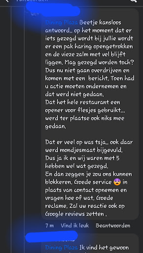 Service moet min 5 zijn. Zeker na het lieve antwoord van Dining Plaza.