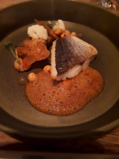 Verder met een Gros Manseng uit de Gascogne van Saint Lannes, uitbundig aroma met frisse citrustonen. Ernaast een mooie strakke presentatie in een blauw schaaltje. Twee stukken tataki van geelvinmakreel in een kruidenjasje, tartaar van geelvinmakreel waarop een plakje pompoen en gewelde mosterdzaadjes, verder nog een sappige Zeeuwse mossel, structuren van pompoen en wortel, takjes rood hoorntjeswier en dotjes crème van Mimolette (verrassend), aan tafel afgewerkt met een lauwwarme saus van wortel en passievrucht met 1001 nacht specerijen. Hele delicate smaken met mooie ziltige toetsen die door de mooie zuren van de wijn werden aangevuld, genieten. (8,5)