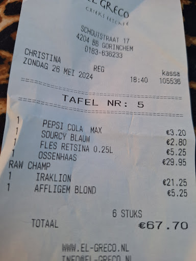 Read moreEen avondje met familie. Wij waren wat later dus parkeren was een dingetje. Maar om de hoek een parkeerplek gevonden. Toen wij binnen kwamen, was het erg lawaaierig. Na zo'n minuut of 10 kwam de serveerster om te vragen of wij wat wilden drinken. De rest had al wat. Daarna kwam de menukaart. Het tafeltje naast ons zat nauwelijks en daar werd gelijk gevraagd of zij een Ouzo van het huis wilden. Huh, dat werd ons niet gevraagd. Gelukkig is mijn zwager brutaal dus gevraagd of dat ook voor ons kon gelden. En daar kwam de Ouzo. Een keuze werd gemaakt. Een Griekse tafel voor 2 personen, pittige kip, bifteki, een leeg bord voor de kleine en een voorgerecht voor mij als hoofdgerecht. Er was vantevoren gezegd dat het veel zou zijn dus geen voorgerechten behalve een broodje met kruidenboter en tzaziki. De kruidenboter was erg weinig voor het brood en bij de tzaziki zat niets aan brood? Toen de hoofdgerechten. Alles kwam op tafel behalve het voorgerecht, Feta Saganaki. Mijn zus had haar bord al bijna leeg terwijl mijn voorgerecht nog steeds niet op tafel stond. Eindelijk kwam mijn gerecht. Twee stukken gefrituurde feta met een bakkie honing. Dat voor € 11,50? Het brood wat bij dit gerecht hoort, ontbrak. Ook de koolsalade was bijzonder. Het was een salade met hompen sla, komkommer, tomaat, ui, wat olijven, wat feta en paprika. Genoeg patat maar geen mayo erbij. Af en toe werd er gevraagd of wij nog wat wilden drinken. Ik vond de gyros op de Griekse tafel schotel wat flauw. De bifteki op de schotel was leeg? Dan is het toch geen bifteki? Misschien zijn wij verwend met een Griek in de buurt maar voor mij was dit een...