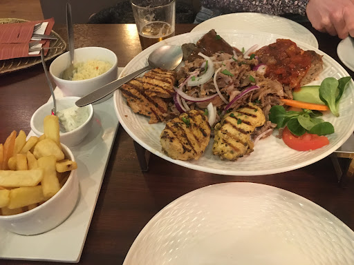 Behalve de aankleding in het restaurant is hier niks Grieks aan qua smaken. Ook de Ouzo was slechts water met een anijssmaakje. De jonge serveerster vroeg of alles naar wens was toen wij nog niks op tafel hadden, beetje vreemd. Het concept (all you can eat) is verreweg van beschreven, saladebar was kapot en hiervoor in de plaats kreeg je een lullig bakje koolsalade. Het kindermenu zou tegelijkertijd met het knoflookbrood geserveerd worden. Dit brood bevatte geen knoflook en was slechts hard gebakken in olie. Het kindermenu kwam pas toen wij al klaar waren met onze eerste koude ronde, na 2x vragen. Het kleine bakje frietjes van onze mixed grill had ons zoontje maar opgegeten. Ons vlees was koud ondanks dat het op een warmhoudplaatje met 2 waxinelichtjes stond. Toen die na de eerste ronde uit gingen en de serveerster met het volgende koude bordje kwam, en het er op zette, gaf ik aan dat ze op waren. Ze zei dat ze wel een aansteker ging pakken. Nogmaals aangegeven dat ze op waren. Ze kreeg ze dus ook niet aan. Bij haar aangegeven dat dit alles niet was wat wij hadden verwacht, na alle lovende recensies. Nog een poging gedaan om het tweede koude bordje te nuttigen, dit uit eindelijk laten staan want het was echt niet lekker. Geen smaak, droog en niks Grieks aan. Adverteren met biefstuk en dan zo'n droog, dun lapje serveren...schaamteloos! Behalve iets wat op gyros leek, kon ik de rest van het vlees niet thuis brengen als redelijke kenner. Ook de beschreven gerechten die ze zouden serveren zaten er niet allemaal bij. De bordjes worden geserveerd alsof het voor 1 persoon is. (Snap ik ergens nog wel als het AYCE is, maar toch, het zag er triest uit). De kipnuggets van het kindermenu smaakte raar en bijna zoet, hij laat dit nooit staan maar nu dus wel. Het personeel sjeesde langs zonder aandacht voor de gasten. Mijn man keek op de keuken en trok een aantal keer groen weg, ze pakte met hun handen vlees, dit kan echt niet! We hebben ons enorm geërgerd aan het personeel, het vieze eten en de vreselijke herrie. We konden andere tafels beter verstaan dan elkaar. Toen ik voortijdig af gingen rekenen ging er een oudere man waar ik moest afrekenen, ineens heel amicaal doen en over mijn schouder wrijven. Zorg liever dat je de keuken aanstuurt! Maar vragen of alles naar wens was, deed hij niet. Ook de de wc's waren erg smerig! Dit uitstapje naar een andere Griek hadden we achteraf nooit moeten doen. Wij blijven trouw aan Poseidon in Zoetermeer die wél Grieks eten serveert, met passie! Misschien dat er sinds kort een andere chef in de keuken staat die zijn passie ergens is verloren? Ik snap nog steeds niet waarom het zo'n domper was. Normaal zijn we geen koopjes jager maar als je goede recensies leest, verwacht je niet dat het bizar slecht is! We hebben een dag later ook alle 3 buikkrampen en diaree gehad, bedankt. Als jullie je niet interesseren in de Griekse keuken, klanten of je eigen kwaliteit, krijg je hier mijn...