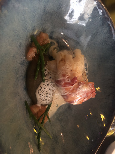 Dan de bijpassende wijn. Wat een onsympathieke manier van uitserveren, een standaard riedeltje wordt bij iedere wijn door de (jongere eigenaar?) opgedreunt. Er is geen enkele compasie, geef ons maar een glas en een kaartje dat is met meer warmte uitgeserveerd. Bij gang 2 zouden we over moeten naar rood maar willen niet bij iedere gang een nieuw glas. We zouden een wij krijgen die bij de volgende twee gangen past. Dit bleek gewoon de witte van de volgende gang zo te zien aan het tafeltje achter ons. Geen creativiteit om een goede oplossing te vinden. Misschien dat we er niet uitzagen alsof we een goed glas wijn kunnen waarderen en er ook wel wat van vinden??
