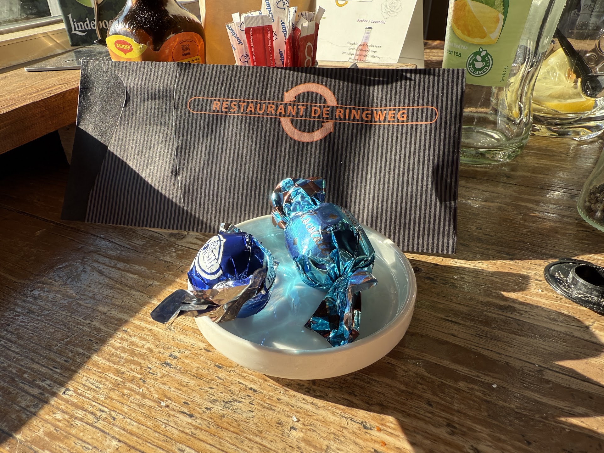 Read moreVoor we naar het theater gaan eerst even eten. Vlak bij het werk dus makkelijk! De menukaart binnen handbereik dus we waren er snel uit. De bami en de Groninger schnitzel. Of de schnitzel werd gebakken of gefrituurd. Gebakken! YES! Die wil ik wel. Het kwam in recordtijd op tafel, het is weet ik geen wedstrijd maar als die er was hadden ze hem in de keuken gewonnen. Alles smaakte voortreffelijk, de gebakken aardappeltjes met een klein krokantje. Bakjes met witlof spruitjes en sla. Oei dat is jammer, witlof en spruitjes daar ben ik geen fan van. De sla was lekker met de dressing. De groente liet ik staan. Tip: Vragen aan de gasten of ze de groente ook lusten? Anders extra sla en daar maak je mij altijd blij mee. De bami ook geproefd want er bleef nog wat over, mijn vriendin is geen grote eter. Mazzelkont ben ik ook, lekkere bami! Goede pindasaus!