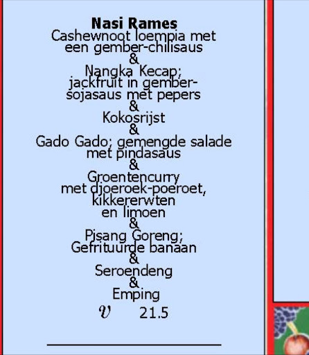 I ordered the items under Nasi Rames (check photo) and everything was delicious. They had an English copy of the menu at the restaurant but I did not take its photo. The food is very flavorful. My dishes contained a salad with some sauce (containing peanut I believe), some chips, rice, coconut, spring roll, fried banana, jackfruit and a vegetable curry. I felt the portion size is quite big and the pricing was very reasonable. I paid only 21 euros for all this food.