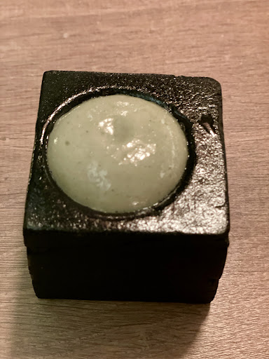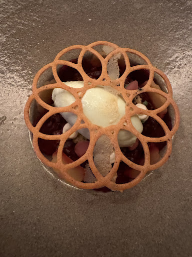 Start van de avond De amuse, een gekaramelliseerde tomaat met schuim, was een smaakvolle verrassing en zette meteen de toon. Daarna werden oesters aangeboden, wat we waardeerden, en we bestelden een halve dozijn. Helaas liet de menukaart op zich wachten, en het duurde ongeveer drie kwartier voordat deze eindelijk werd gebracht. Dit voelde als een gemiste kans in de eerste indruk.