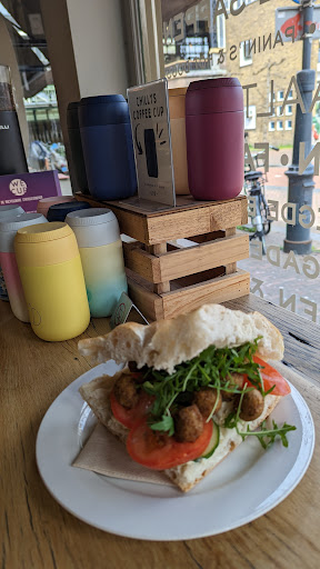 Unwelcoming and unfriendly staff. First you buy something to drink and before you pay they ask if you want to have it take away or consume inside. After you have chosen to consume your drink there they offer you a glass, so far so good.