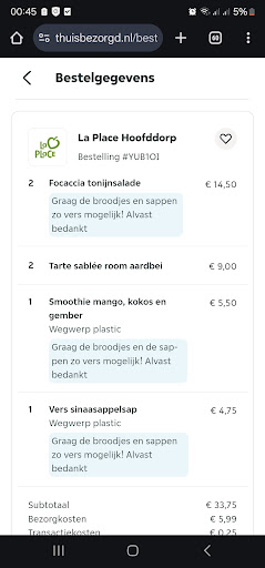 Read moreDe eerste keer dat ik hier heb besteld was ik niet volledig tevreden met de bestellingen, want de broodjes waren niet vers. Afgelopen week heb ik voor de tweede keer besteld en hiermee heb ik ze de voordeel van de twijfel gegeven. Bij de opmerkingen heb ik genoteerd dat ik de broodjes en sapjes zo vers mogelijk wil. Je raadt het al, de broodjes waren totaal niet vers, de broodjes hadden een structuur van oud brood en waren heel erg taai! De smoothie was zuur en de jus d'orange was smakeloos. De bekers waren niet voldoende gevuld, ook de tarte sable taartjes waren oud dit was duidelijk te zien aan de aarbeien en te proeven, letterlijk niks aan de bestelling was goed, wat heel erg jammer en zeer teleurstellend is! Ik raad het niet aan om bij hun te bestellen of...