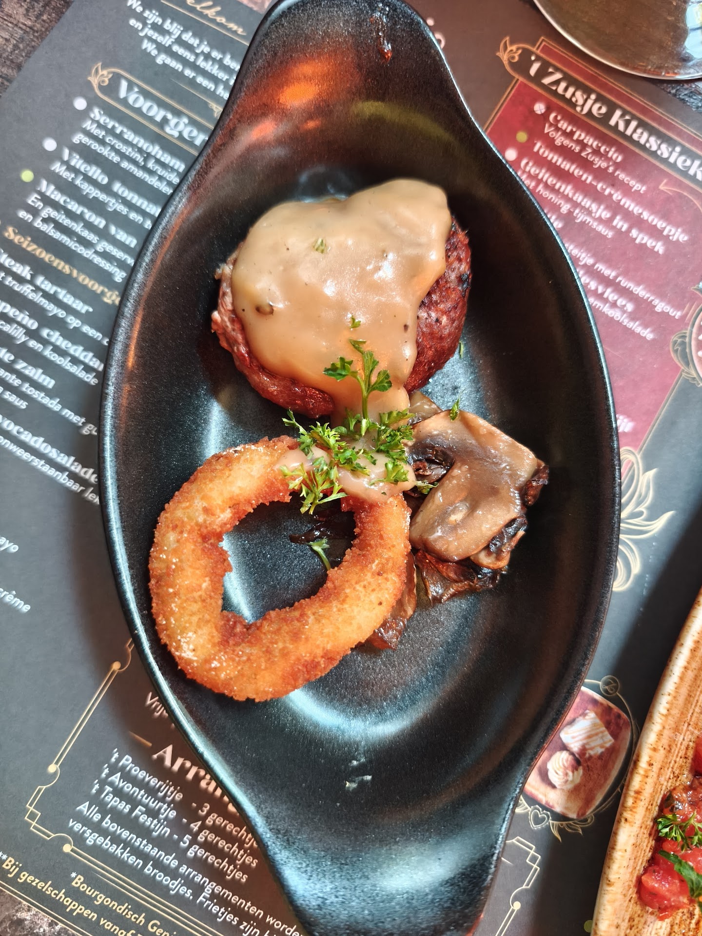 Read moreEindelijk, na een lange tijd weer voor het eerst onze vakantievrienden ontmoet voor een gezellige avond bij 't Zusje Oudenbosch. Deze gereserveerd omdat dat altijd goed was, ja helaas was. Het volgende hebben wij ervaren, zure wijn (was niet waar), bonnetje kwijt (3 kwartier op eten moeten wachten). Pitabroodje met gyros, zonder gyros opgediend. Daarna broodje gyros met koude gyros opgediend. Satestokje erg zout en beetje verbrand,zwart. Gastvrouw(??) vroeg alleen een aantal keer of we wat wilde drinken, verder niks. Toetje ook weer half uur moeten wachten. Ondertussen waren ze al aan het schoonmaken. Lekker eten met een schoonmaaklucht. Daar wat van gezegd, krijg je te horen, ik moet toch ook schoonmaken, op een belerende toon. Echt te schandalig voor woorden. De maat was vol, voor ons. Floormanager bovenstaande gezegd, hij ging de regiomanager bellen, want hij kan niks met de rekening doen. En hij had al 5 jaar ervaring bij Van der Valk, hij wist het wel. Nou hij durfde niet eens aan onze tafel te komen, en hij heeft niet eens zijn excuses aangeboden. Ondertussen hebben wij een andere gastvrouw gekregen die het volledig met ons eens was, niemand wilde meer naar onze tafel komen, maar zij wel. Ze wilde gewoon dat wij een leuke avond zouden hebben met lekker eten. Ze kon zich echt in ons verplaatsen omdat wij helemaal geen zeurende mensen zijn. Uiteindelijk 3 glazen wijn vd rekening gehaald. Wat een oplossing, een aanfluiter vonden wij. Kortom, voor ons geen Zusje meer, het was altijd supergoed eten, hartelijke bediening en meedenkende mensen. Helaas is daar niks en helemaal niks meer van over.