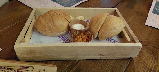 Read moreThis restaurant has a nice ambience. The interior is well-designed and really sets the mood. It is cosy yet spatial & retro yet modern. The food is decorated nicely and I can't dislike the style. Unfortunately though, the hamburger I received was almost entirely raw inside. The inside doesn't look as great as the outside. Next to that, it even had a bitter piece of burned meat or charcoal on it. This left a bitter aftertaste in my mouth that I couldn't even wash away with two gulps of my Pepsi. After all, the experience I had here was exactly that. Good at first sight but it left me with a bitter aftertaste, as the Dutch saying goes. One person I was with ordered spareribs. Others had a taste from that and said it was really good; it looked amazing too. The staff was nice too, even though I heard some negative stories. They apologised for the hamburger and asked if I wanted a replacement. That was really nice and they handled the situation quite well. Therefore I can't give it any less than 2 stars, but not much more than that either. If I had the choice, I would probably go to another restaurant next time. There are enough to find in the city...
