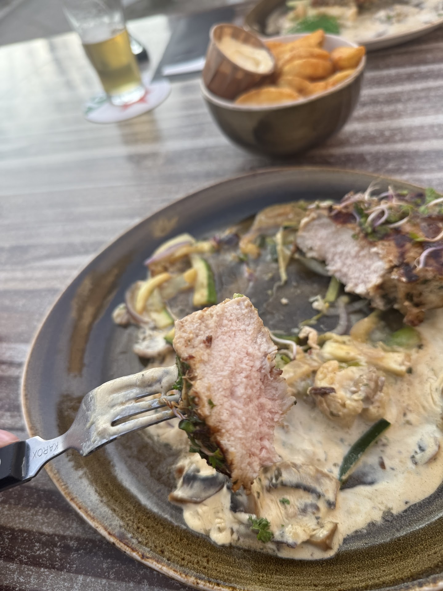 Staff was friendly to provide us with another table which was next to the window instead of the one in the middle of restaurant we got first. We had a starter with gamba's and mussels which were really good. The main dish was a salmon steak as you can see in my photo below. It was good but not great. Personally I didnt like the coating they gave it too much. But as I said it was still good.