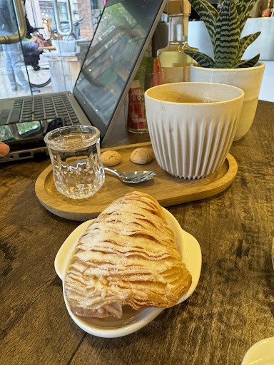 Bij de tweede cappucino nam ik zo'n Italiaans gevuld knapperig dingetje. Ik vond hem erg tegenvallen (ik had gehoopt op roombotersmaak, maar ze zijn kennelijk met plantaardige vetten gemaakt, ik neem aan zodat veganisten ze ook kunnen eten), maar ik bleef nog uren een nasmaak van ranzige olie houden.