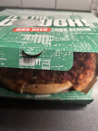 Read moreMijn kennismaking met dit filiaal op 24-05-2024 was gelukkig voor een keer! 2 pizza’s digitaal bestellen en betalen lukte nog wel maar de op de website aangekondigde gratis garlic bread toevoegen niet. Thuisbezorgen bleek ook niet mogelijk ivm. ‘de grote drukte’. Zelf ophalen dan maar want niet te ver weg. Aangekomen trof ik een soort losgeslagen bende aan. De twee jongedames die de deegbollen tot pizza’s maakten stonden in de tussentijd met hun in zwarte latex handschoenen gestoken vingers tussentijds met diezelfde vingers een soort kipnuggets o.i.d. in een saus te dopen en in hun monden te proppen. Dit terwijl een mannelijke collega met twee in geel gestoken pizza-bezorgers luid stonden te donderjagen bij de oven. Druk rinkelende telefoons werden incidenteel beantwoord met de melding dat bestellen ivm. de drukte niet mogelijk was. Binnenlopende klanten kregen dezelfde mededeling of de keuze van een lange wachttijd aangeboden. In de tussentijd vlogen de frustraties over een productie achterstand en een niet terugbellende collega (en kennelijke manager?) in het rond waarbij balorig soort van werkstaking werd geopperd terwijl ik samen met twee andere wachtenden dit hele circus aanschouwden. Voorts had ik nog een discussie over het wel of niet gratis zijn van het knoflookbrood. Uiteindelijk verliet ik na twintig minuten deze obstinate heksenketel zonder enige aansturing met mijn complete bestelling. Voor hetzelfde geld volgende keer weer naar onze traditionelere pizzabakker wanneer die van zijn...