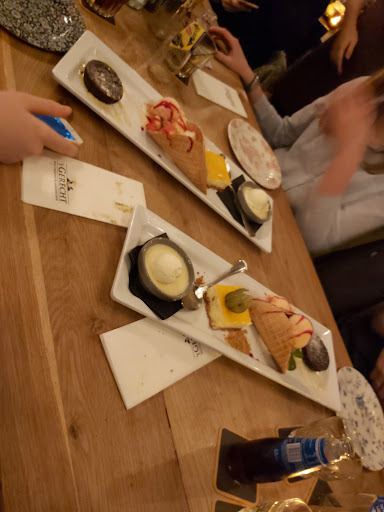 Het nagerecht was ook een proeverij van diverse: chocotaartje met vloeibare vulling half warm mocht iets warmer van mij, panna cotta leek meer op wittechocolade gelei vond ik iets tegen vallen, ijs met ((verse) vers fruit van groothandel) vruchten in een ijshoorn xxl prima, cheesecake achtig taartje (machtig ) en lekker helaas zat daar een versiersel op welke katst verrot was (geen foto van gemaakt , physalis ) Tevens kwamen die borden vermoedelijk net uit de vaatwasser die waren nog +45 graden!
