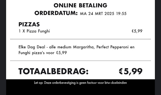 I ordered a pizza with dessert, from the same app I always use, thuisbezorgd, with the same address where I live, (I don't have any others) and after 1 hour, still no one shows up, I only get a call from a stranger for a few seconds who doesn't even give me time to pick up the phone and answer because it was already finished, I call and they tell me they have another delivery address and that they called me (with an unknown number) and that I didn't answer so nothing, no food or refund (24 €, something), the girl on the phone was quite sour and without the slightest professionalism, rude and without consideration for the customer, it seemed like I was talking to an arrogant high school student, now that I'm a regular customer (at least 2 times a week) rest assured that you won't...