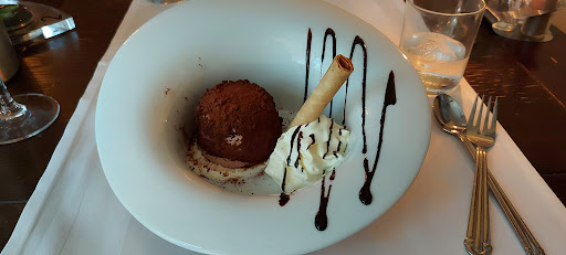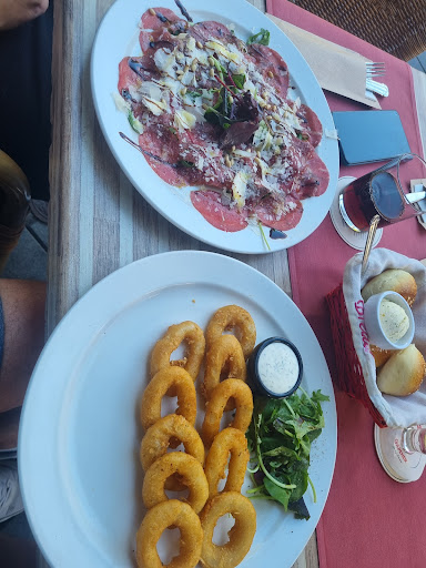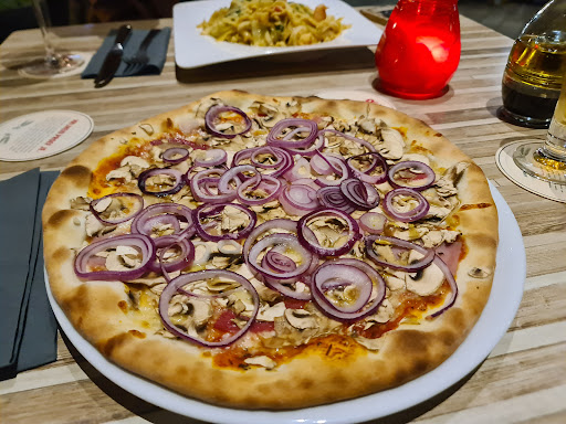 Little Italian restaurant across from dominos. This is the 2nd Italian restaurant that had bland pizza. However, the scampi penne was tasteful and not dry. The atmosphere inside is like a high-class Italian restaurant with white tablecloths and cloth napkins. Outside is still cozy, but you're overlooking a parking lot and dominos. The waiters were nice but a bit slow, taking orders and getting the check. I will say that the food came pretty quick. Ok, there were only two of us at the restaurant. 43 euros for the two of us with wine and beer. Oh, positive note on the pizza, very good crust and fresh veggies just a bit bland. If your dutch you will like it but...