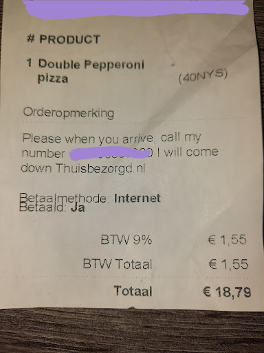 Overigens zou ik nog steeds graag mijn geld terug willen van alle bestellingen die door de zaak zelf zijn geannuleerd, en dat er een goede oplossing komt voor het leveren van de verkeerde pizza. Ik betaal niet voor niets extra geld om het zelf...