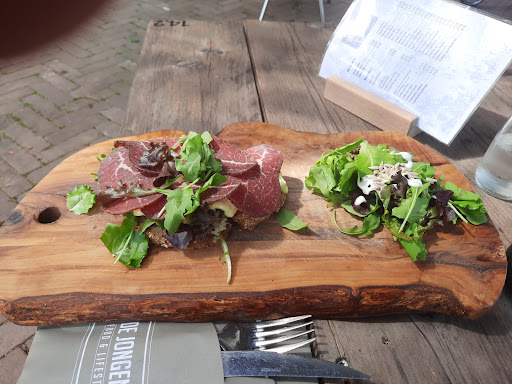 Het waren inderdaad jongens die zorgden voor een vlotte bediening. Een mooi ingericht restaurant. Ze afficheren zich met de slogan "Food en lifestyle". Het laatste betreft een aantal interieurdecoraties die te koop zijn. Het "food" is terug te vinden in een uitgebreide drankenkaart met tal van koffie- en thee-variaties en dat geldt ook voor het blond schuimend bier. Daarnaast keuze een aangeklede zuurdesem boterhammen en tosti's met biologische streekgerechten. Ik maakte gebruik van het terras. Loungebanken met daarvoor een laag houten, tafeltje (model salontafel). Niets aan de hand bij een drankje, maar de "spijzen" , geserveerd op bord of plank, moet je op schoot nemen, wil je niet dat je kleding nadien naar de...