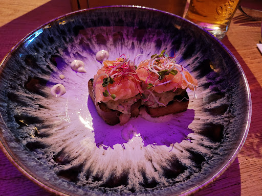 Read moreDoor de hoge beoordeling had ik, ondanks de eenvoudige menukaart, relatief hoge verwachtingen van Grand Café Toi Toi. Helaas viel mijn ervaring behoorlijk tegen. Het voorgerecht bestond uit twee geroosterde (lees: verbrande) briochebroodjes met een karige hoeveelheid zalm en kostte maar liefst €13,50. Als hoofdgerecht had ik een kalfsribeye. Deze was goed medium gebakken, maar was te zout en werd enkel geserveerd met wat plakjes wortel. De bediening viel ook tegen; de menukaarten werden vrij vlot gebracht, maar de serveersters bleven vervolgens weg. De tafel werd niet in de gaten gehouden, waardoor de (vaak lege) glazen op tafel bleven staan.
