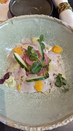 Wij kozen dus voor het 5 gangen menu. Bijzonder was dat wij niet echt de menukaart hadden gezien, wel de 'bites' kaart. Foutje of misverstand aan onze zijde? Het maakte nu niet uit want na de website gezien te hebben had het 5 gangen verrassingsmenu al mijn voorkeur. Je kan eventueel ook uit nog meer gangen kiezen.