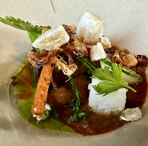 En dan het eten... Elk gerecht was een klein kunstwerk. Niet alleen op het bord, maar ook in de smaak. Diepe, duidelijke smaken, prachtig in balans en esthetisch zo verfijnd opgemaakt dat je bijna vergat te eten – bijna, want weerstaan was onmogelijk.