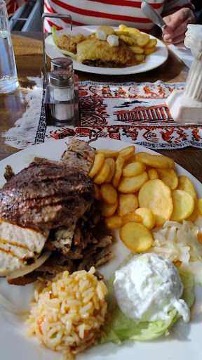 We hadden een schotel met gebakken aardappeltjes, tzatziki , gyros, gehakt een snitzel en een spiesje. De aardappelen waren vettig en zacht, de gyros was van zeer matige kwaliteit , pezig en smaakte niet erg vers. Het gehakt ging wel, het varkensvlees smaakte als enige redelijk en was goed gekruid. Geen groenten alleen een klein blaadje sla met daarop een heel klein beetje tzatziki. Alles werd geserveerd op één bord. Het vlees zag er erg bleek uit.