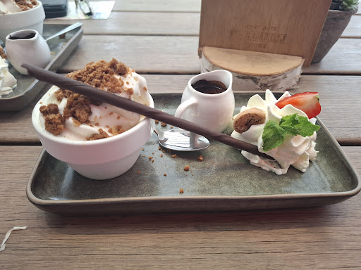 Het personeel is vriendelijk en het terras is gezellig. Ik had een uitsmijter en mijn vrouw het broodje kip saté. Ons zoontje nam de kindertosti. Alles smaakt heerlijk en konden erna weer met een gevulde...