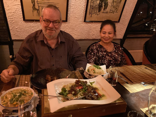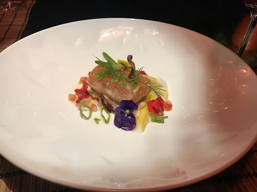 We kozen voor het 6-gangen verrassingsmenu met een bijpassend wijnarrangement van halve glazen. Over het algemeen waren de gerechten lekker, met de zalm en het dessert als echte uitschieters. En het zeeboeket was geweldig met de dansende groenten. Ook zat ik na 6 gangen echt vol, iets wat niet gauw meer gebeurt bij de betere restaurants tegenwoordig. Een verademing waren de noodles die bij het hoofdgerecht werden geserveerd. Een grote misser was de kip (gang 4) die was echt niet lekker, veel te zoet. Ook snapten we de cherrytomaatjes niet helemaal bij de appetizer.