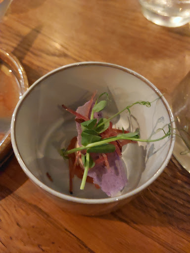 Read moreAangename, informele ambiance. Wonderlijk genoeg niet vol op een zaterdag avond. Dit is niet in lijn met de positieve recensies die ik had gelezen. Aan tafel worden we al snel voorzien van verschillende amuses waaronder een kleine flammkuchen en een tartalette met pompoen op pompoen geserveerd. Fijne en lichte smaken. Tussendoor komt nog een hutspotsoep met kokos. Wonderlijk lekker.