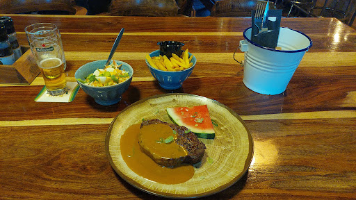 Met 12 personen wezen eten. Vanaf buiten konden we de sfeer binnen al proeven! Aantal moters binnen staan, een oude auto als kassa en een aantal prachtige opgezette koppen van een eland en een koe aan de muur.