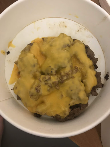 Zoonlief wilde echter zo graag een cheeseburger van Juicy dat ik, na maanden, het nog één keer heb geprobeerd. Om 19.42 uur de bestelling geplaatst. Om 20.45 de telefoon gepakt en de gebruikelijke excuses gehoord: "Je zult het niet geloven maar we zijn net onderweg! (Juicy Burgers zit 700 meter verder op.) Om 21.00 uur heb ik deze foto gemaakt van een cheeseburger die direct uit elkaar viel.