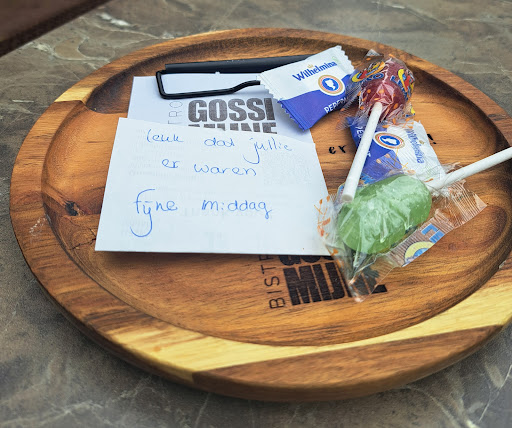 De reservering was vlot gemaakt: een tafel voor 4, bij het raam. Iets eerder dan gepland stonden we binnen in Gossi Mijne. Het eerste wat me opviel was de grootte van het restaurant in vergelijking met het restaurant in Venray: veel te klein, dicht op elkaar en donker. Donker in de zin van onvoldoende verlichting. De jonge gastvrouw Brit kwam naar ons toe en vroeg of we het "concept" kende, en daar waren we bekend mee. Maar nieuw voor ons het gebruik aan tafel van een Ipad. Volgens Brit heel makkelijk (ik legde nog even uit aan haar dat een Ipad een andere besturingssysteem heeft dan een andere merk tablet [Samsung], en dat er genoeg...) Brit legde de werking van het bestel app uit en het eerste drankje was onderweg.