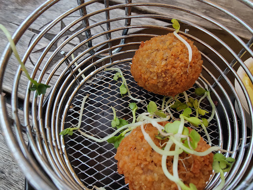 We werden hartelijk begroet en tafeltjes aan elkaar gesloten met het aantal krukjes erbij (waar je tijdens het wachten al een houten achterwerk van kreeg en instabiel op zat) Er is geen uitgebreide menukaart. Je kunt kiezen uit spareribs (all you can eat), fish & chips of een hamburger. Spareribs 19,50 (was het niet waard), fish (jumbo diepvries lookalike) 11,50, zgn (soepgroenten in een jasje) vegetarische burgers 13,75. 4 personen uit ons gezelschap bestelden all you can eat spareribs, 2 personen bestelden de vegetarische burger en ikzelf fish&chips. We kregen tot 2x toe een emmertje met onsmakelijk ogende bestek en bovendien nog met etensresten. Mijn mes liet een vettige vlek na op mijn servet, afgeveegd voor ik ging eten. Ze hadden te enthousiast mijn bord gevuld met frieten 2 stukken vis die je ook bij de jumbo kunt kopen en bovendien niet knapperig maar donkerbruin en hard. De vis was taai en droog. Bij de salade moet je niet hoesten want dan vliegt het van je bord (zo weinig.) ik heb liever meer salade dan die friet. De spareribs waren niet te eten. Ze waren lauw, ondanks dat de gastheer ons later vertelde dat ze vers bereid werden in de oven. Ja wel raar.. Behoren ze dan niet heet te zijn? Ze proefden als oud vlees dat te lang in een opwarmbak hebben gelegen. En de saus was verdampt. Hun tweede portie, hoopten ze!, zou misschien beter zijn. Maar dat was niet zo. Ook niet lekker, droog, oud, onsmakelijk. Eindelijk na 3x vragen kregen de andere twee hun vegetarische hamburger. (de ene bedienster zei ze hadden wel vegetarische burgers, de andere zei niet en ze waren ons al zat, aan hun gezichten te zien) er zat een gat in de zijkant en zag Soepgroenten erin. Soepgroenten met een jasje eromheen. Intussen was natuurlijk onze bedienster ons redelijk zat en ontweek ons eerst toen we wilden afrekenen. Of alles naar wens was? De tweede portie spareribs werden niet opgegeten. De bediening maakten zelfs fouten met de bestellingen. Kwamen met 3 gewone hamburgers ipv 2 vegetarisch. Drankjes die we niet gevraagd hadden maar bestemd waren voor de tafel verderop. Afrekenen/betalen: wat hebben we lang moeten wachten toen we weg wilden. De bedienster negeerde ons, toen er voor de rekening gezwaaid werd, zwaaiden de host en de bedienster terug. We hebben langer dan 20 minuten moeten wachten op de rekening en ons beklag. De host wilde ons laten geloven dat alles vers bereidt was. Dan verwacht je toch sappig en heet vlees en vis etc. En niet dit. Een lachertje! We kregen ons drankje gratis (11 euro-7personen) maar de niet opgegeten spareribs en de oude troep wel. Hier gaan we nooit meer eten!! Alleen de uitstraling en interieur binnen is een plus, vandaar die 1 ster. Voor de...