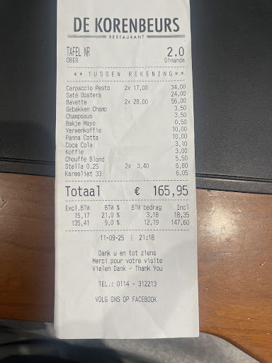 Read moreDe enige reden dat ik één ster heb gegeven is omdat er geen nul sterren gegeven kunnen worden. Gisteren gebakken zeetong á € 38,— per portie besteld in restaurant de Korenbeurs. De vis die ik op mijn bord kreeg was hard en taai, leek eerder gecremeerd dan gebakken. De snackbar aan de overkant van de straat had deze vis waarschijnlijk nog beter kunnen bereiden. De bediening ‘zou kijken of de kok iets kon regelen’. Dat kon hij en vijf minuten later kreeg ik tot mijn stomme verbazing mijn zelfde vis terug op een bordje. Deze was nu gefileerd en een beetje gebakken in de boter. Nóg meer gebakken en hij had die vis de eerste keer al verpest door deze veel te lang te bakken! Ik heb meneer de kok het bord terug in zijn handen gedrukt en niet betaald. Hij was hoogst verbaasd want kreeg anders nooit klachten. Mij zullen ze daar...