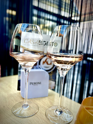 Eerst maar eens een aperitiefje, in de vorm van een Pinot Grigio Blush. De gastheer van de avond kwam met de fles aan tafel en vertelde van alles over deze zacht fruitige rosé. Hij schonk ons een klein beetje in en gaf ons de gelegenheid om de wijn te proeven. Verrassend, want behalve in het hogere segment, zie je dat niet vaak eigenlijk. Een dikke pluspunt.