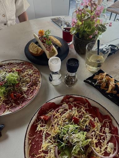 We werden leuk ontvangen op 2de paasdag en kregen vlot een drankje geserveerd door een vriendelijke dame. Zij kwam de kaart brengen met de mededeling dat de sashimi van zalm en de zalm waren uitverkocht en er was nog 1 tournedos. Jammer maar we kozen toen samen voor de chateaubriand de specialiteit van het huis. Na 5 minuten kregen we de mededeling dat ook deze was uitverkocht. En helaas was de tournedos ook weg. Er stond ook een gerecht Nice to meat op de kaart maar zonder omschrijving. Aan de aardige dame gevraagd wat dat voor vlees was. Ze zei spareribs en zo???? Op mijn vraag wat en zo was kon ze niet antwoorden. Maar ik ga het voor u vragen. Helaas wilde de kok geen antwoord geven zodat wij zeer sterk het vermoeden kregen dat wij zouden worden afgeserveerd met de restanten van de schaarste voorraad. Jammer als je voor de eerste keer in je nieuwe woonplaats wil gaan eten. Wel met veel excuses en een gratis drankje zijn we maar verder...