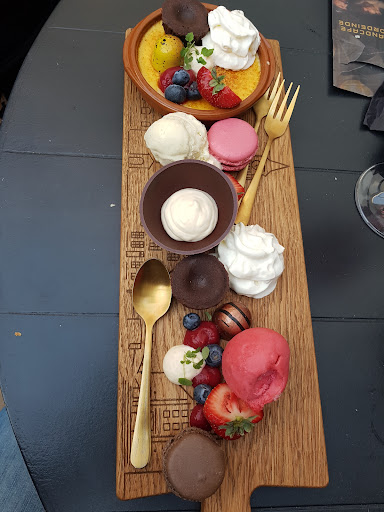 Zeker niet geschikt om lekker te dineren. Broodplankje was goed, wél raar dat er geen mesjes waren dus smeren met een lepeltje, maar ok. Vervolgens: