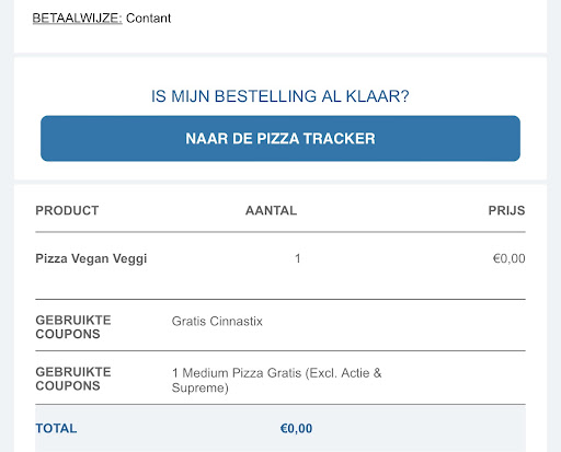 Pizza van mijn punten besteld, plus een coupon via de app voor gratis cinnastix. Netjes bevestig gehad, haal ik mijn pizza op, vergeten ze mijn cinnastix. 10 min staan te wachten op mijn cinnastix, kom ik thuis pizza koud. Vragen ze mij om mijn mening. Dus ik leg het uit. Krijg ik 5 keer uitgelegd dat ik de cinnastix nooit had mogen krijgen en wat ik gehad heb fraude is. Het was gewoon mogelijk via de app. Eigenaresse Yous slaat in de e-mails een toon tegen me aan, dus ik bewijs gestuurd. De app versie en de bevestiging per mail waarin het duidelijk sta dat ik de cinnastix gratis heb. Ik ben mij van gaan kwaad bewust en was altijd een trouwe klant. Sla zoโn toon lekker tegen je familie aan, maar niet tegen een trouwe klant.