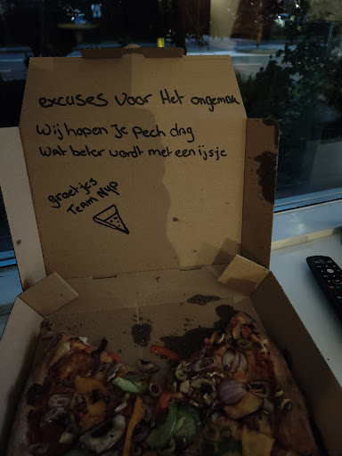 Ik weet niet wat ik heb besteld, maar het was zeker geen pizza. Het leek alsof de pizzabodem een identiteitscrisis had en besloot dat hij een flensje wilde zijn. Toen ik de pizza optilde, zakte hij als een natte dweil in mijn hand. De toppings gleden eraf alsof ze wisten dat ze ook niet thuishoorden op dit gastronomische fiasco.