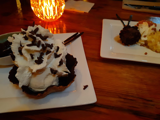 De vis werd geserveerd met niets- behalve veel te lang gekookte groene asperges. Gortdroog dus. Zelfs geen citroen erbij. Derde gerecht, kip piri piri ook dodelijk saai. Niets op het bord behalve saus. En droog, gortdroge kip. Er zat nog een gedeelte schaal met dikke frieten bij, net een voldoende. Maar ook dat is zo strafbaar, friet. Ga naar de markt en haal 5kg lekkere aardappels om het eens anders te doen. Bakje sla, met een kaas en noten. Alleen… de noten bevatten ook pinda’s. Pinda’s in de sla is zelden een succes helaas. Toetje: “Traditionele Tiramisu” en Sticky brownie. Wat een aanfluiting. Gekocht in de groothandel, uit de verpakking op het bord. En ook nog middelmatige kwaliteit.