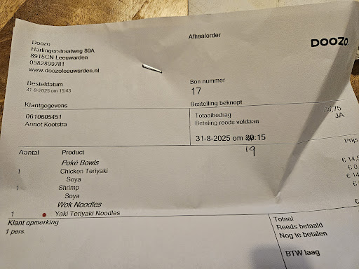 Zo hebben wij onze eerste ervaring bij Doozo mogen ondergaan. We hebben de Doozo Platter afgehaald en binnen 5 minuten zaten we al te smullen. We hebben al redelijk veel verschillende sushi restaurants door Nederland bezocht en deze behoort toch wel tot de beste van Friesland tot nu toe en absoluut in onze top 5 overall! Met name de Spicy Tuna Uramaki was erg verassen vanwege de welkome maar onverwachte smaakexplosie. Mochten ze ooit bedenken de optie te geven om echte wasabi voor een paar euro meer aan te bieden dan zou dat een absolute 6 sterren worden....