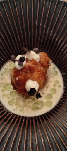 We arrived at 7:00 p.m. on Friday 08/12/23. They welcomed us kindly, we took a seat at the bar and ordered the 8-course menu. So far so good. But then the appetizer arrived: three mini bites, all simple and random. Little more to say.