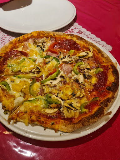 Hier uiteten geweest met z’n tweeën. Bij binnenkomst een niet gezellige sfeer, alles in het rood en lijkt uitgestorven. Eenmaal met de serveerster aan de praat geraakt bleek dat ze alleen Engels kon. Bestelling opgenomen en toen we ons voorgerecht kregen bleek de stokbrood met kruidenboter een paar reepjes platgedrukte pitabroodjes te zijn, en onze tomatensoep was lauw zonder inhoud. Toen we ons voorgerecht op hadden en werden afgeruimd werd er na 10/15 min ons hoofdgerecht gebracht, keurige verhouding kwa tijd. Pizza leek op een gebakken wrap met een beetje tomatensaus en wat kaas, een niet echt rijkgevulde pizza dus. Verder was de pizza oke. De tent was onvoldoende belicht waardoor het net leek alsof je in een ondergrondse bunker zat te eten. Als je het een likje verf geeft, de belichting optimaal en beter indeelt, je pizzabodem iets dikker maakt en het beleg op de pizza wat royaler maakt, denk ik dat dit een zeer leuk en gezellig restaurantje kan worden. Verder aardig personeel en ze hadden je drinken zo klaar. Er zit zeker potentie in deze tent maar dat ligt hem dan vooral...