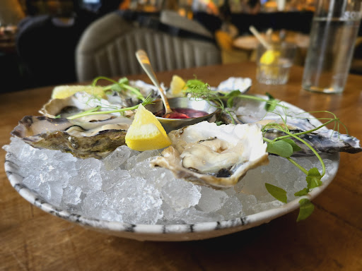 We begonnen met oesters, geserveerd met een sjalottenvinaigrette. De oesters waren heerlijk vers en op ijs geserveerd. De vinaigrette en de zilte smaak van de oesters waren mooi in balans en smaakten ons zeer goed. Het homarium (Oester Aquarium) stond wat in een hoekje en zou een prominentere plek kunnen krijgen. Tijdens ons bezoek waren kinderen met het water van het homarium aan het spelen. Hoewel dit niet direct invloed had op de hygiëne, konden de kinderen gewoon hun gang gaan. Dit past wellicht bij de ongedwongen sfeer, maar kan voorkomen worden door het homarium een andere plek te geven.