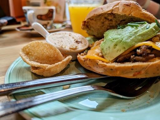 We had a great visit here. Stopped in for something to eat between a breakfast and lunch. Had a black coffee, a mushroom "burger", and a slice of peacan pie. All of it was very tasty. Personally I could have done with a smear of butter on the bagel but that's me. The coffee was above average. The peacan pie was, in my opinion, nontraditional but no less tasty for it. The tables are small and mostly suited to just a couple of people, but a few could accommodate a larger group. Overall just a nice menu with many compelling options and fair prices. The service was so friendly and present (this was a particularly strong point for me). I felt very welcome. Bathrooms we very bright and clean. Not an overly loud environment either. You could speak comfortably with your company. Sitting on the second level provides one with a bit...