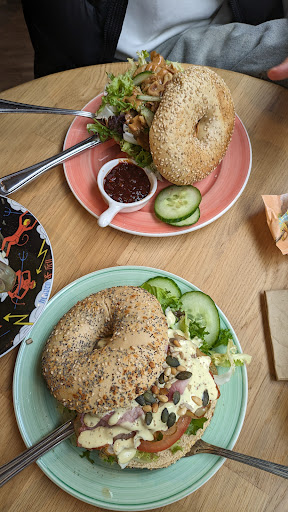 Read moreExtremely nice place: lovely atmosphere and great service (they were super kind and all the positive adjectives you can think of when talking about customer service). I had true chance you enjoy my order outside: if you can, do it also!!! The bagel I ordered (warm one, mushroom patty with lettuce, parmigiano cheese and truffle mayonnaise plus extras of melted cheddar and avocado with whole-wheat bagel) was delicious, the bagel was not hard, perfectly toasted. I also ordered a booster (orange, carrot and ginger) that was refreshing! Totally...