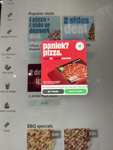 Read moreMisleading marketing strategy. I have make an order in this domino’s restaurant on site on the machine, it showed me there’s a deal there and I can get a free pizza credit, then after I finished the order and get the pizza I paid, the staff told me that the orders made on the machine didn’t count and I can only get the credit by ordering from the app. I think this is a very misleading thing to the customer as I won’t have ordered this pizza if it didn’t show the discount! I need an explanation and a...