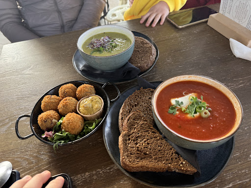 The atmosphere was calm and welcoming, and even if the weather had been cooler, the café still has a cozy feel inside that makes it a nice choice year-round. The staff were very friendly and gave great recommendations. I was told to try the Dutch bitterballen, which were delicious, crispy on the outside with a rich, savory filling. I also had one of their soups, which was full of flavor and felt very natural, fresh and very comforting.
