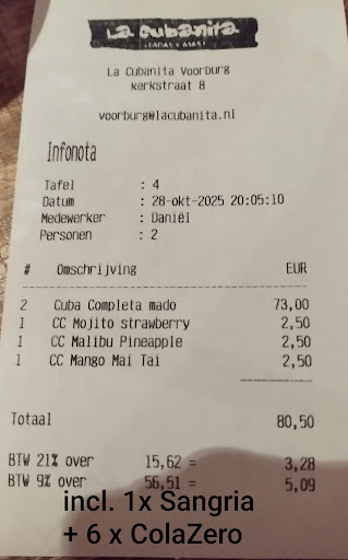 Read moreZeer kind onvriendelijk restaurant, bij onze reservering duidelijk doorgegeven dat er 2 kinderen van 2 jasr meekomen, helaas stonden er geen kinderstoelen klaar daar hadden wij toch echt om moeten vragen, ook beweert La cubanita Voorburg nu dat zij mijn vrouw telefonisch hebben geprobeerd te bereiken om door te geven dat er geen kinderstoelen zijn, maar dat lukte zeggen hun niet, apart want nooit geen nummer van hun in gemiste oproepen gehad, maar dat La Cubanita Voorburg ook mijn vrouw haar emailadres heeft en dus deze mededeling had kunnen mailen daar is dan zeker niet over nagedacht! Geen ruimte om kinderen te verschonen en het overslaan bij het toetje ook nog iets om te benoemen, ook geen ijsje krijgen nadat erom is gevraagd! Bij het afrekenen ben ik inderdaad te aardig gebleven door te zeggen dat alles naar wens was, maar heeft mijn vrouw zeker haar ongenoegen geuit t.o het personeel bij onze tafel. Je zou denken dat het personeel dit wel bespreekt met elkaar en de leidinggevende. Nogmaals smaak vh eten was lekker maar wij hebben niet...